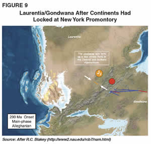 By about 290 million years ago, dextral strike-slip motion of Gondwana relative to Laurentia was arrested when a continental promontory in the vicinity of New York City locked Gondwana and Laurentia at a pivot point. Figure 9 shows the configuration of Laurentia and Gondwana after the continents had locked at the New York promontory (indicated by the large red dot). For the next 15 million years or so, Gondwana spun in a clockwise fashion around the New York promontory.