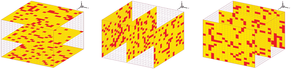 As a measure of the quantity of kerogen or organic richness, TOC is defined as the mass percent of organic matter in the shale matrix. The model considers no limits in the connectivity of different porosity systems. Kerogen grid blocks can neighbor other kerogen and inorganic grids, or be located directly adjacent to fracture grids. Figure 1 shows a cross-section of a single shale matrix block where kerogen blocks (red squares) are dispersed randomly in a frame of inorganic matter (yellow).