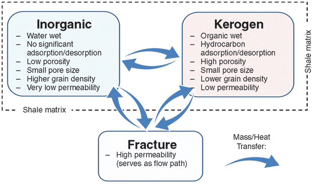 To better characterize subtle pore systems, a state-of-the-art, microscale model with a shale subdivision scheme has been developed. It partitions porous media in shale into three submedia (i.e., porosity and permeability systems) with distinctive characteristics–inorganic matter, kerogen, and the natural or hydraulic fracture network–and then applies appropriate convective or diffusive flow mechanisms to each submedium.