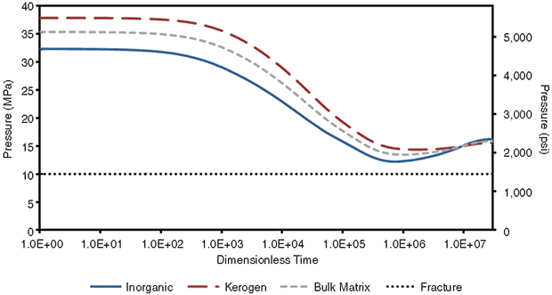As shown, pressure in the inorganic matter decreases when hydrocarbon production starts as oil and gas leave water-wet inorganic matter (with higher gas and organic phase pressures) toward the low-pressure fracture network. At later times, when pressure depletes in the matrix, water phase pressure in the water-wet inorganic matter falls below the fracture pressure, resulting in counter-current water imbibition from the fracture into the matrix.
