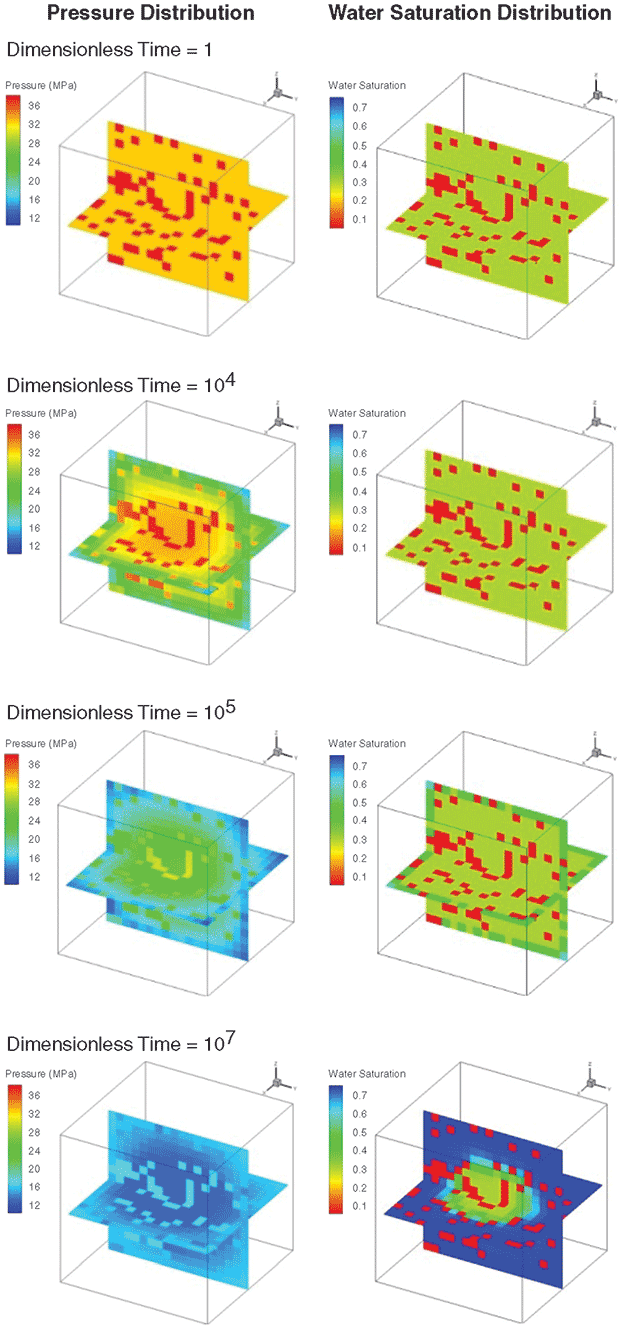 Mass transfer dynamics are better understood using 3-D maps of pressure and water saturation distribution in the shale matrix. Figure 4 shows modeled results at four production times. The red blocks in the saturation and pressure map at the early production time represent kerogen randomly distributed in the inorganic frame. As expected, pressure in the matrix begins to decrease as hydrocarbon production starts through the surrounding low-pressure fracture network. While pressure in the matrix depletes, water saturation does not change considerably during the early stages of production. This is because water relative permeability in water-wet inorganic matter is low and water is not able to establish its way from the fracture to the matrix.