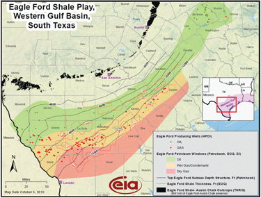 So far, the model has been dominated by Texas basins, but it is spreading geographically. The first application of the model was in the Barnett Shale by EOG Resources. It was then applied in the Cleveland Sands in the Granite Wash, spreading from Texas to Oklahoma, and within the Granite Wash to the Des Moines formation. It now is being most vigorously, profitably and famously applied in the very young Eagle Ford Shale (so young, in fact, that the first well was drilled barely two years ago by Petrohawk).