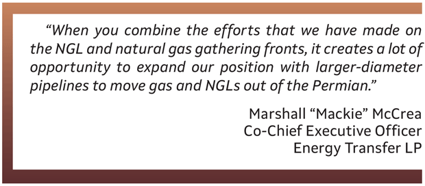 “When you combine the efforts that we have made on the NGL and natural gas gathering fronts, it creates a lot of opportunity to expand our position with larger-diameter pipelines to move gas and NGLs out of the Permian,” McCrea says.