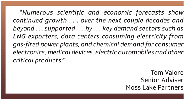 “Numerous scientific and economic forecasts show continued growth in natural gas and liquids production in the Permian Basin over the next couple decades and beyond,” observes Valore. “This growth trajectory is supported not only by major producers’ forecasts, but also by key demand sectors such as LNG exporters, data centers consuming electricity from gas-fired power plants, and chemical demand for consumer electronics, medical devices, electric automobiles and other critical products.”