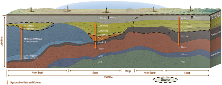 Having lime, shale and carbonate formations stacked one atop the other in both STACK and SCOOP–including the Oswego, Atoka, Morrow, Springer, Meramec, Osage, Woodford, Caney, Sycamore and Hunton–provides multiple horizontal oil and gas targets, mitigates risk and increases recoverable reserves, he says.
