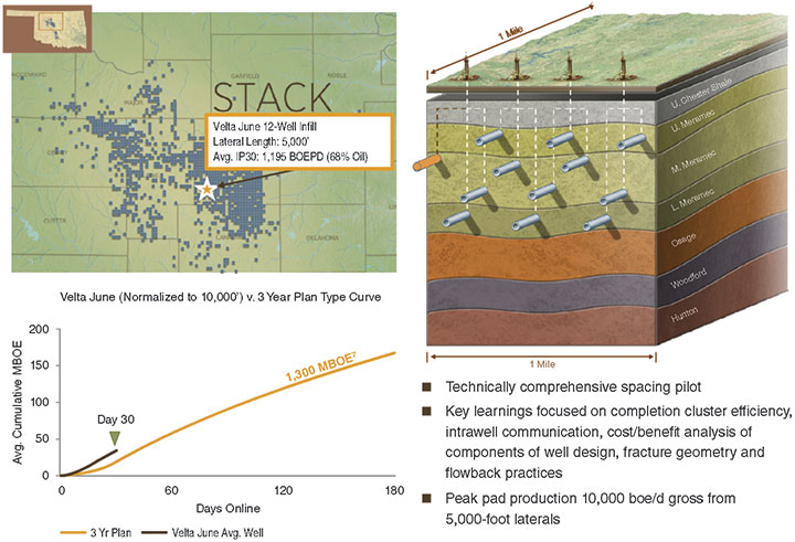 “The Velta June is one of eight pilots that we have done so far,” he says. “Most have been 10 wells, but the Velta June was 12-well spacing. Newfield now has completed 80 infill wells in STACK, and has tested four-12 wells a section in the Meramec horizon.”