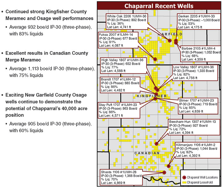 Chaparral entered into a 30-well joint venture agreement with Bayou City Energy in late 2017. In total, the company says the program consists of 17 wells in Canadian County and the rest in Garfield County. Bayou City will invest $100 million and pay 100 percent of the well costs. Chaparral will receive a 15 percent upfront working interest. Once the program’s return requirements are met (14 of the wells have been drilled, with four wells now on production), Chaparral will have a 75 percent working interest in the 30 wells. In addition, the company retains all acreage and reserves outside the wellbore.