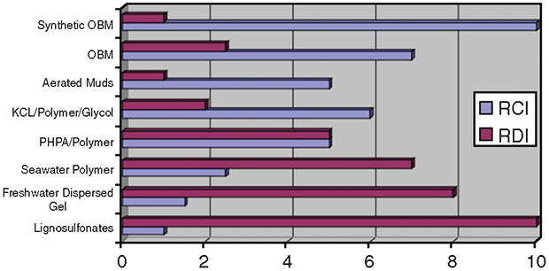 In today’s cost-conscious industry, cost per barrel is obviously a key consideration in selecting the best fluid option. However, a mud system’s cost per barrel can be very misleading unless all cost factors are considered, and deciding on the wrong fluid can be a very costly mistake. Figure 1 shows the relationship between the cost index and the relative damage of eight fluid types, with the cheapest mud causing the most damage to the producing zone. While more complex fluid systems cost more, they may eliminate potential drilling problems that could turn into major nonproductive time (NPT) events.
