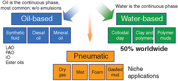 The chemistry of any drilling fluid depends on the base fluid used for its construction–pneumatic, water or oil–and sets the chemistry of all the additives used in the system. Figure 2 shows the various systems for each base fluid.