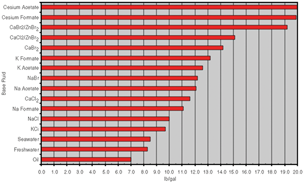 While drilled solids are “bad” solids and high density-weight materials such as barite are “good” solids, all solids can contribute to contamination problems and high pressure drops that cause high equivalent circulating densities (ECDs). Saturated brines can be used in place of mineral-weight materials such as barite in many drilling operations. The majority of wells seldom require mud weights higher than 14 pounds per gallon. Figure 3 shows the maximum densities at saturation that can be obtained with a variety of brines versus pure water and oil.