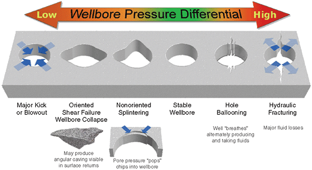 There are many mechanisms involved in wellbore stability, including unconsolidated formations, tectonic stresses, abnormal pore pressures, and swelling clays in shales. In any case, the first line of defense is to have the proper mud weight (Figure 4). The vast majority of formation footage drilled is through some type of shale containing various types of clays. Some clays are very active (swell) and some are not. It is well established that NADFs can eliminate wellbore instability caused by clay swelling. The primary mechanism for this is the osmotic control of water flow from the mud to the formation and vice versa. The correct mud weight must also be in place.