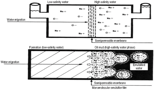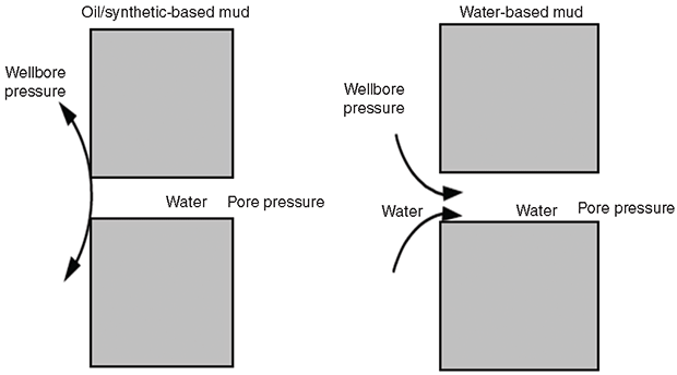 One way an NADF enhances wellbore stability is by making the wellbore completely oil-wet. A water-wet wellbore allows water invasion as a result of capillary action (Figure 5A). Calcium chloride (CaCl2) is the most common additive for osmotic flow control (Figure 5B) in NADFs. CaCl2 imparts a very low activity in the water phase, thereby producing the largest osmotic pressure driving force.