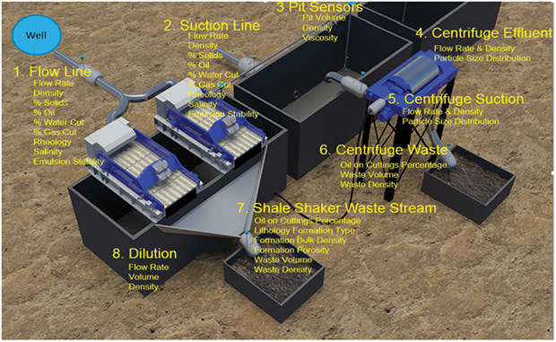 From a drilling fluids system standpoint, Figure 9 shows an example of the types of surface measurement and monitoring instrumentation available; in this case a system developed by Zaxxon Instruments LLC. The process uses a system of sensors and programmable logic controller-based software covering the circulating system and all of the solids control equipment. Zaxxon has developed several “drilling fluids data processing modules” that utilize the flow rate, density, mass flow rate and temperature data from Coriolis meters to infer drilling performance characteristics and improve the diagnostic understanding of the system.