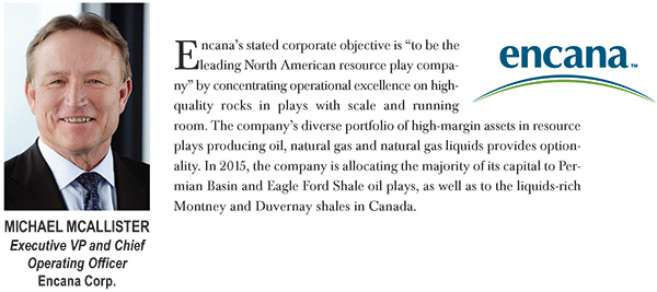 Encana’s asset teams are maximizing these plays’ potential by finding ways to operate more efficiently, McAllister reports. “We built tremendous momentum in driving down costs through 2014, when costs were generally moving in the opposite direction in the industry,” he says. “This year, we expect to achieve a 15 percent improvement in capital efficiency through efforts across the company.”