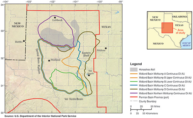 The petroleum industry divides the Wolfcamp Shale in the Midland Basin into four stratigraphic units, based on petrophysical log signatures and landing zones for horizontal wells, according to the U.S. Geological Survey (USGS). The uppermost is labeled the Wolfcamp A, followed by the underlying Wolfcamp B, C and D units, respectively. The survey says the eastern margin of the Wolfcamp Shale deposition prograded westward through time, as indicated by the larger depositional areas delineated in the C and D assessment units when compared with the A and B assessment units. The USGS projects the Wolfcamp Shale play holds as much as 20.0 billion barrels of oil, 16.0 trillion cubic feet of associated natural gas and 1.6 billion barrels of natural gas liquids.
