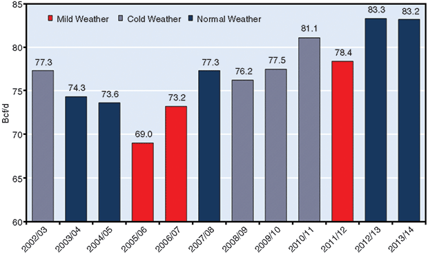 Changes in winter weather can have a particularly significant impact on demand in the residential and commercial sectors. Consider the difference in demand between the winters of 2010-11 and 2011-12 (i.e., 942 Bcf, or 17 percent) as a classic example. This winter, December and January are forecast to be colder than last year, while February and March are forecast to be milder (March 2013 was the coldest in 16 years). The net effect of these offsetting parts of the winter season is that total residential and commercial demand is expected to be about the same as last winter, with a slight decline of 1 percent (300 MMcf/d).