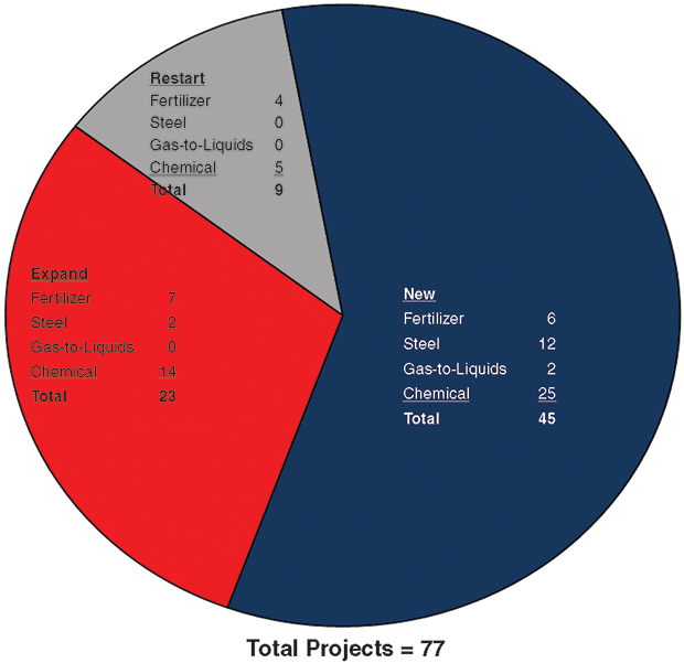 Thanks to shale plays, the supply surety, relativly low cost and environmental benefits of natural gas are creating competitive advantages for industrial users, particularly those in four key segments leading demand growth in this sector: fertilizer, chemical, steel and gas-to-liquids. These industries are making significant capital investments to expand capacity. As illustrated in Figure 2, there have been 77 capacity expansion projects announced to date, which include restarting previously mothballed units, facility expansions, and the construction of “greenfield” plants. All of these projects are major consuming facilities that use natural gas a feedstock or burn significant quantities of gas as an energy source.