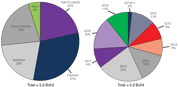 With respect to the longer-term impact of these 77 projects on natural gas consumption in the industrial sector, Figure 3 summarizes the anticipated increase in gas consumption for each major industry, with a total of 3.9 Bcf/d for all projects through 2020 (collectively increasing industrial sector demand by more than 20 percent). To provide additional insights, the chemical industry has been subdivided into the petrochemical and methanol segments.