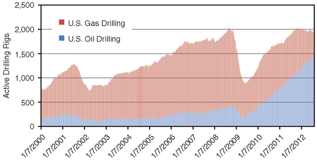 On natural gas, our views this time last year have proved correct, but with delayed timing. After hitting a peak in February 2011, the natural gas rig count was falling last summer. However, gas drilling turned around and hit its 2011 high during October. But early November 2011 was the last time one could tally a gas rig count at 900 active rigs, and by mid-August 2012, it stood at very nearly half that level.