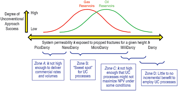 Most often, system (or weighted) permeability of the reservoir located adjacent to propped fractures constitutes the primary driver. Figure 1 visually summarizes the ranges of formation system permeability that consistently allow the successful application of unconventional reservoir development techniques. Historically, conventional drilling and completion practices focused on permeability zones C and D, and completions usually involved vertical wells and minor–if any–stimulation. Reservoirs with Zone B permeability (the sweet spot in the North American shale revolution) and Zone A either were passed up intentionally, or resulted in unsuccessful completion attempts using conventional technologies.