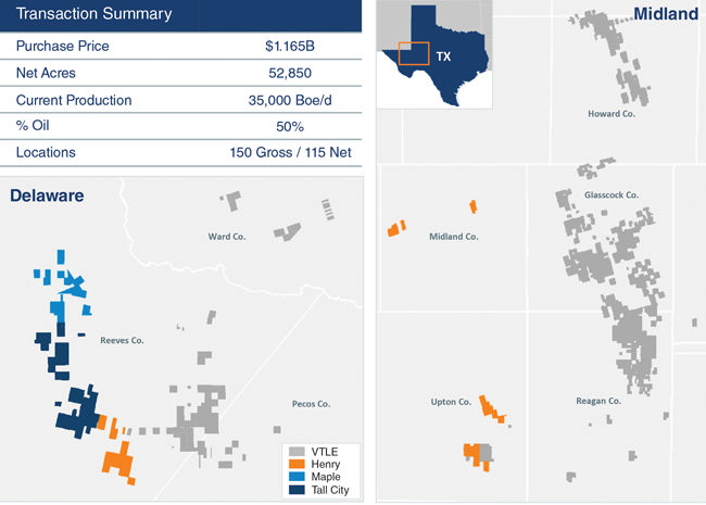 Vital indicates it is purchasing Tall City’s Delaware Basin assets for $285 million in cash and 1.58 million common shares. It also is purchasing Maple’s Delaware Basin assets in an all-equity transaction consisting of 3.31 million common shares.