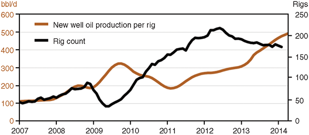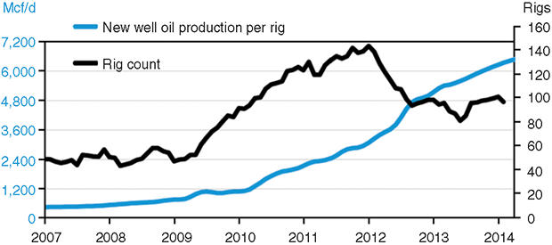 The ability to drill more footage (i.e., more wells) per rig is, in part, manifested in production growth in resource plays such as the Bakken Shale in the Williston Basin, the Marcellus Shale in Appalachia, and the Eagle Ford in South Texas. Production per rig from new wells–a key metric of both well productivity and operational efficiencies–is increasing dramatically in these basins.