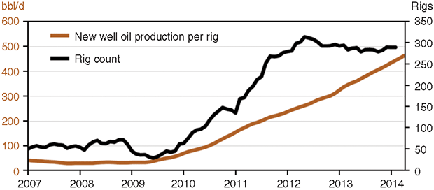 According to EIA data (Figures 1A-1C), oil production per rig from new Bakken wells is averaging 500 barrels a day, compared with less than 200 bbl/d per rig from new Bakken wells in early 2011. In the Marcellus, natural gas production per rig is 6.5 million cubic feet a day, compared with 2.5 MMcf/d for new wells drilled in early 2011. In the Eagle Ford, meantime, new well production per rig jumped from 150 bbl/d of oil in early 2011 to 375 bbl/d in early 2014.