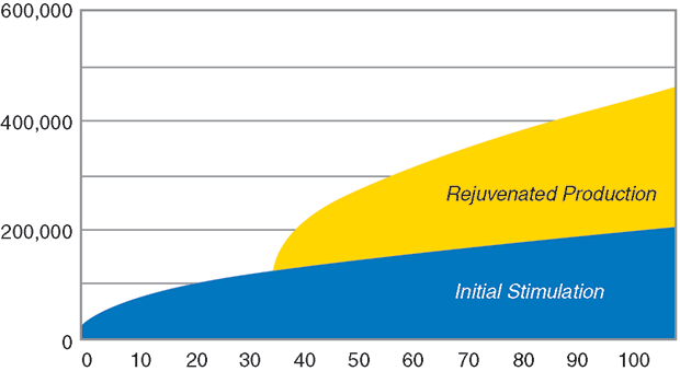 The steep decline curves in unconventional reservoirs typically result in 10 percent or less recovery of available reserves. By restoring connections to previously stimulated intervals and tapping into zones that were missed in the initial stimulation treatment, a properly planned well rejuvenation program re-establishes production levels and significantly increases total reserves recovery.