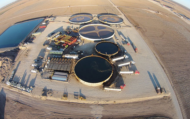 The aboveground storage lagoons range in size from 300,000 to almost 600,000 barrels when full, he says. The pits are connected with lay-flat pipe and underground pipe to flow water from one pit to another to ensure ample water supplies in various locations.