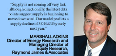 “Supply is not coming off very fast, although directionally, the latest data points suggest supply is beginning to move downward,” Adkins reports. “Based on data from public companies, it looks as if U.S. supply was down 1.0 billion-1.5 billion cubic feet a day though the end of the third quarter compared with the first quarter. Our model predicts a supply decline of 3.0 Bcf/d by early next year. So while supply is trending down, there is no question that the magnitude of the response is nowhere close to what many expected.”