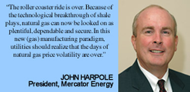 “The roller coaster ride is over,” he declares. “Because of the technological breakthrough of shale plays, natural gas can now be looked on as plentiful, dependable and secure. The industry is no longer exploring for gas, but manufacturing it. In this new manufacturing paradigm, utilities should realize that the days of natural gas price volatility are over.”