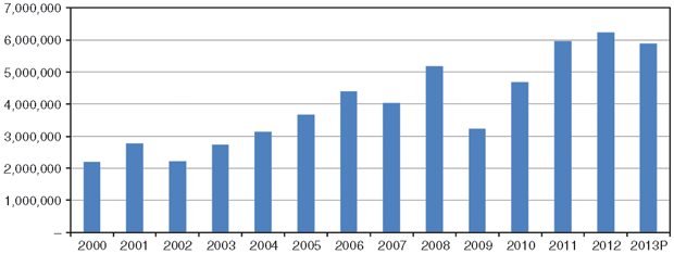 Despite the decline in rig counts since August 2012–with oil drilling edging down from 1,425 to 1,397, and gas drilling dropping from 484 to 388–activity remains historically strong (Figure 2). Knowing where that drilling is occurring is an integral part of understanding the consumption of OCTG products. Obviously, rig activity has shifted dramatically toward horizontal drilling to enable operators to better access hydrocarbons in shale gas and tight oil deposits. Since 2004, horizontal drilling has gone from 10 percent to 62 percent of the total U.S. rig count. This has caused per-well OCTG consumption to double, from about 80 tons a well on average across the United States in 2004 to about 160 tons a well through the first half of 2013.