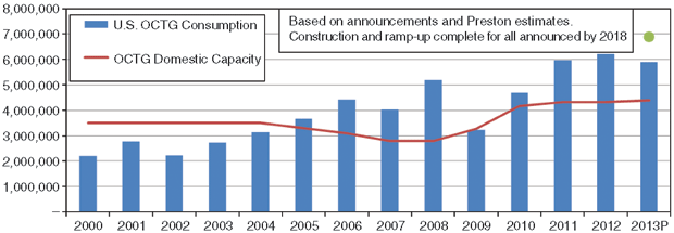 On the domestic front, a significant capacity expansion is well under way. The participants include existing domestic pipe producers, new producers and foreign producers apparently interested in avoiding trade entanglements. When we wrote about this last year, the announced capacity increases amounted to about 50 percent of installed capacity in 2009. Further announcements over the past year will result in a doubling of capacity since 2009, assuming all the announced capacity gets built.