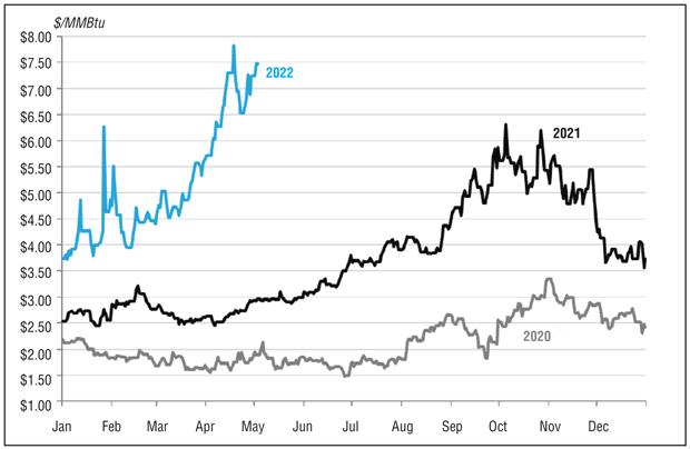 WASHINGTON-On May 4, natural gas prices on the New York Mercantile Exchange closed above $8.41/MMBtu. It was the highest front-month close since late June 2008 and was matched only by closing prices recorded during four other periods: late 2000 to early 2001, October 2004, autumn 2005 to early winter 2006, and the winter and spring of 2008. On the same day, crude oil closed at $107.81, extending a triple-digit pricing pattern experienced during a handful of times in the industry’s history: 1980, 2008, and 2011-14.
