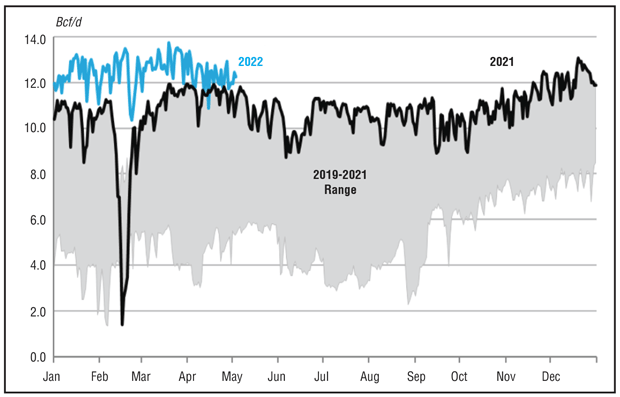 Weekly weather-driven demand for natural gas was expected to slump by 3.6 Bcf/d in the second week of May as heating demand faded. Notwithstanding the brief heat wave in Texas, weather-driven gas demand is expected to slide lower week-over-week as late-season overnight space heating demand cascades lower into mid-May, opening the door to repeated triple-digit weekly injections.