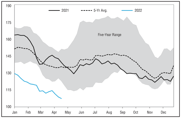 WTI is likely to extend near-term consolidation with continued coronavirus lockdowns in China, rising interest rates, and a strengthening U.S. dollar. By mid-summer, however, rebounding Chinese demand will coincide with peak seasonal demand in the United States, Russian supply may subside and OPEC gains diminish, and inventory concerns loom large as the market eyes the end of supply-side infusions from global strategic petroleum reserves.