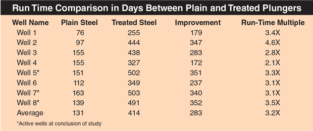 The three remaining wells with B4C treated plungers were still running at the study’s conclusion. These wells recorded an average run time improvement of 348 days compared with the plain steel plungers (Table 1).