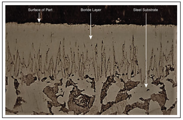 The plungers treated with B4C lasted so long because the treatment alters the base 4140 barstock’s surface characteristics. The treatment creates a slick, hard, intermetallic boride layer that (unlike coatings or platings) does not alter the dimensions of the part. The treated surfaces’ slickness, hardness and corrosion resistance all contributed to the plungers’ longevity by protecting them from abrasion and corrosion.