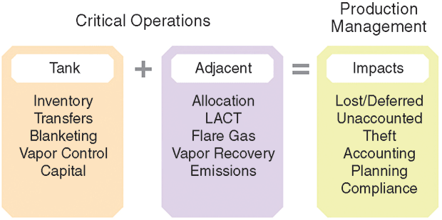 Monitoring and optimizing critical operations on a daily basis from an overall system perspective deliver a number of benefits. Timely insight into fluid handling and transfers helps achieve daily production targets while ensuring measurement compliance. Vapor control and recovery reduces hydrocarbon emissions and lost production. A standardized systems approach to applying integration helps maximize capital efficiency and cash flow against escalating facility and operating costs.