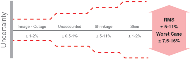 The root mean-square error of the typical values encountered in the field indicates a potential uncertainty of 5-11 percent. It should be noted that each operation is prone to uncertainty creep and operational bias, which can lead to a worst-case uncertainty in the 7-16 percent range. One operator’s efforts to verify the extent of measurement variability within a team of gauges indicated volume discrepancies were actually as high as ±8 percent.