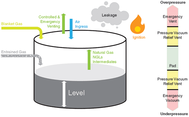 Vapor control is a balancing act against the various operating variables shown on the left-hand side of Figure 3. Storage tank filling and pump-out operations, various sources of natural gas, flashing of light-end hydrocarbons, and leakage points make it challenging to ensure controlled containment. Overpressuring increases natural gas losses normally used to generate production revenue. Introducing oxygen and water into the head space as a result of a temporary vacuum can lead to an explosive gas mixture forming in the tank and can reduce tank integrity because of accelerated corrosion.