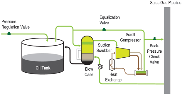 A scroll compressor-based VRU skid includes a number of interesting design features, such as a heated multistage gas/oil stabilizer to inhibit the dilution of lubrication oil with natural gas liquids. Combining this feature with a low oil carryover (<1.0 parts per million, independent of flow) and an eight-gallon oil reservoir help reduce annual maintenance programs.