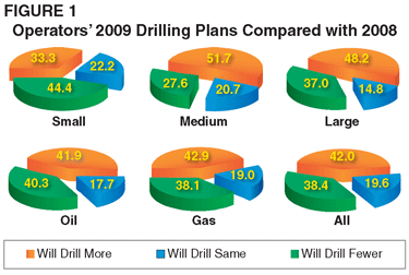 More reflective of the whole, the large category of survey respondents says it expects the final 2009 well count to dip 4.0 percent, while the medium category actually projects an increase of 4.1 percent in 2009 drilling. Between the oil- and gas-categories of respondents, oil-well drillers foresee tougher times ahead, projecting a decline of 11.4 percent, compared with a minus 7.8 percent for gas-well drillers.
