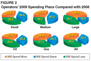 Spending forecasts are even more upbeat, with 64.1 percent indicating they will spend as much or more drilling wells this year as they did last year (Figure 2). Gas-well drillers (those that indicated they targeted natural gas with more than half their 2008 wells) are more positive than are oil-well drillers (respondents that indicated they targeted crude oil with more than half their 2008 wells). Among gas-well drillers, 68.3 percent say they expect to spend as much or more in 2009 as they did in 2008, compared with 60.0 percent of oil-well drillers.