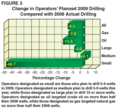 Those relationships persist through survey respondents’ projections for total 2009 drilling activity (Figure 3). There, the small category of respondents anticipates taking the biggest hit, projecting total wells drilled will be down 48.7 percent. However, it should be noted that because of the small number of wells drilled by respondents in this category–an average of 3.5 in 2008, which drops to 1.8 in 2009–any shift in well numbers causes a large percentage change.
