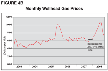 A year ago, 2008 survey respondents indicated they expected to receive $6.28 an Mcf for their natural gas production during a survey period when spot prices (Henry Hub) ranged between $7.36 and $6.66 an MMBtu. During the period operators were responding to the 2009 Survey of Independent Operators, gas prices ranged between $7.06 and $6.32 an MMBtu, and they pegged $6.43 an Mcf as the price on which their 2009 drilling plans were based.