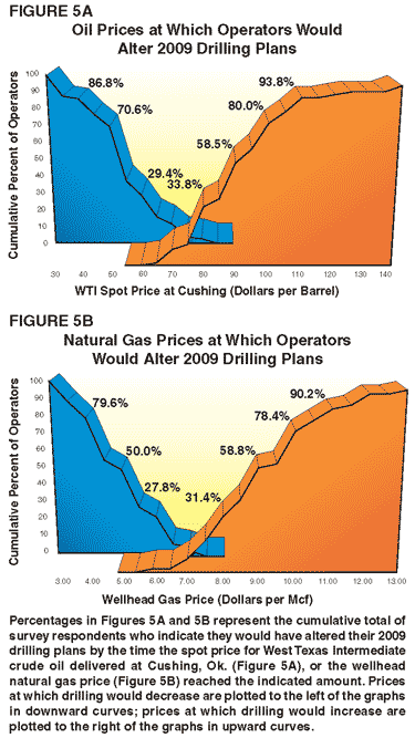 For natural gas, a downward price movement would elicit a quicker response than would rising prices. At $5.50 an Mcf for gas (Figure 5B), 27.8 percent of survey respondents say they will drill fewer wells this year, while an even 50.0 percent say they will cut back at $5.00 an Mcf. If prices fall to $4.50 an Mcf, 55.6 percent of survey respondents indicate they will reduce their 2009 drilling plans, while 79.6 percent say they will re-evaluate at $4.00 an Mcf.