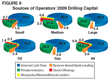 Survey respondents indicate internal cash flow will fund 72.9 percent of their 2009 drilling budgets (Figure 6). Another 23.5 percent comes from private investors, according to survey respondents, while reserve-based lending provides 2.6 percent, and stock offerings along with mezzanine and nontraditional lenders account for the remaining 1.0 percent.