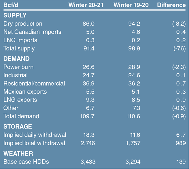 At some point, Permian output is expected to bounce back and resume growth, but with low oil prices, gas production across the basin is predicted to decline to 10.5 Bcf/d after flowing at 12.5 Bcf/d last winter. Additional declines also will be seen in the Eagle Ford, SCOOP/STACK, Bakken, Gulf of Mexico and other oil-rich plays, further tightening the market.