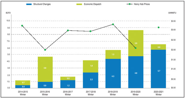 Adjusted for weather, winter power burns have risen 6.5 Bcf/d since 2013-2014, primarily because of gas-fired plant additions that have displaced retiring coal-fired and nuclear power plants, according to research by Energy Ventures Analysis Inc. Figure 3 illustrates “structural” gas-fired growth versus temporary “economic” fuel switching in the electricity generation sector. With low prices last winter, a sizable share of the power burn demand was associated with economic dispatches of gas versus coal. Although it is likely that higher prices will mean coal takes some of this winter’s economically dispatched power burn, more than 7,500 megawatts of gas-fired capacity have been built during the past year alone, structurally expanding the share of natural gas in electricity generation.